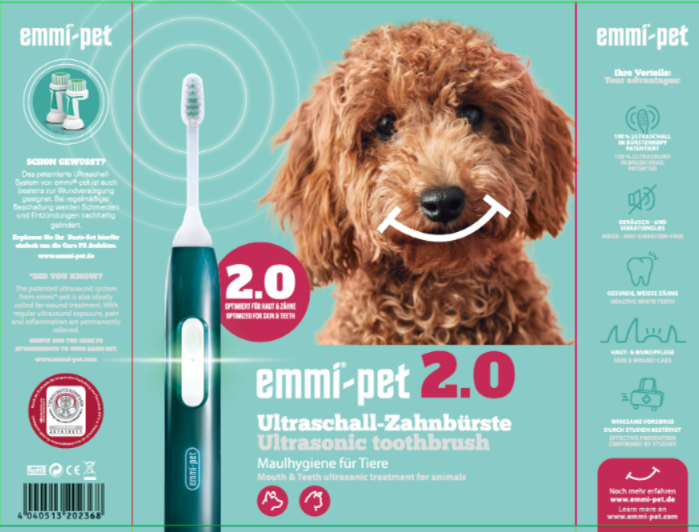 Met de Emmi®-Pet is nu ook de eerste ultrasone tandenborstel voor dieren beschikbaar, die de tanden van honden grondig en zonder te bewegen reinigt. Omdat de ultrasone tandenborstel volkomen geruisloos werkt, is de tandenborstel ook geschikt voor honden die weigeren hun tanden te laten verzorgen met een conventionele tandenborstel. Reinigen met een ultrasone tandenborstel helpt bij het effectief voorkomen van ontstoken tandvlees, parodontitis, tandsteen, mondgeur en tandverlies.