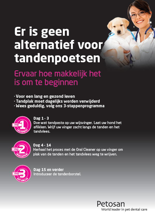 Petosan Oral Cleaner voor het eenvoudig reinigen van de tanden en de mondholte bij pups en honden. Door het poetsen van de tanden en het tandvlees worden tandplak en bacteriën verwijderd. De Petosan Oral Cleaner past goed om de vinger waardoor het voor de meeste honden een goede manier is om te starten met gebitsverzorging en het 3 stappenplan.